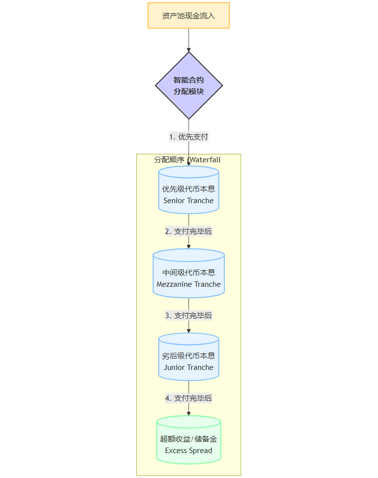 现金流瀑布 (Cashflow Waterfall):这是CDO的核心机制。所有进入资产池的现金流,都像瀑布一样,从最高层(优先级)开始向下流动,逐级满足兑付要求。智能合约确保了这一过程的自动、精确和强制执行。