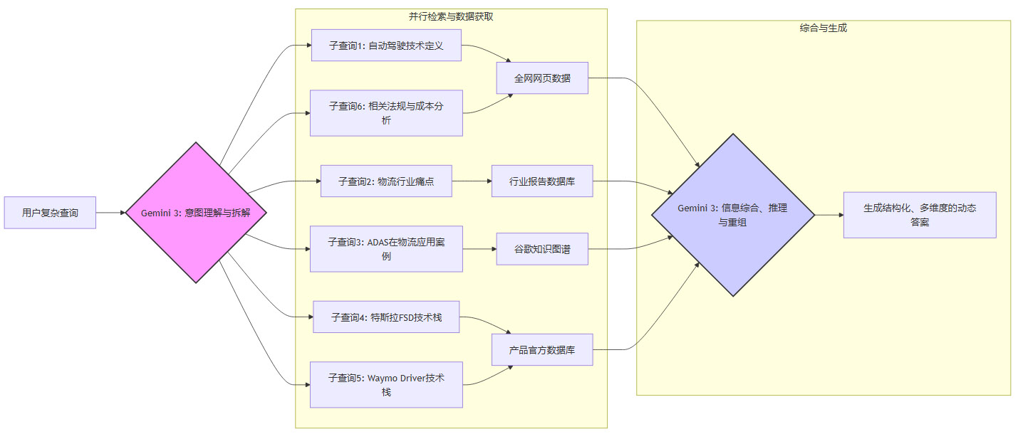 本次升级的背后,是Gemini 3在信息检索、多源数据融合及多模态处理方面的一系列技术突破。其中,“查询扇出技术”是重构复杂检索流程的基石。