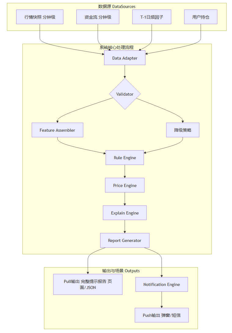 从设计哲学到具体实现,我们始终强调可解释性、可执行性和风险控制。系统的价值不在于预测未来,而在于严格执行一套正期望的交易纪律,帮助交易者克服情绪的干扰,在波动的市场中保持一致性。未来的迭代方向将聚焦于引入更多维度的因子(如历史分位估值、行业轮动等),并探索将规则引擎与机器学习模型相结合,以实现更智能的动态阈值调整。