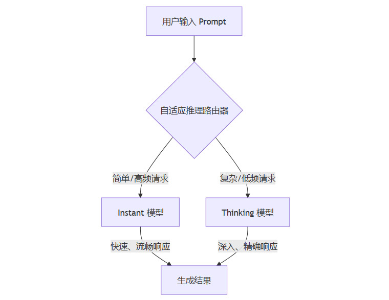 双模型架构的精髓,在于其间的自适应推理机制。该机制扮演着一个**智能路由器(Intelligent Router)**的角色,它在接收到用户请求后,会进行快速的预分析,然后决定将任务分配给哪个模型。