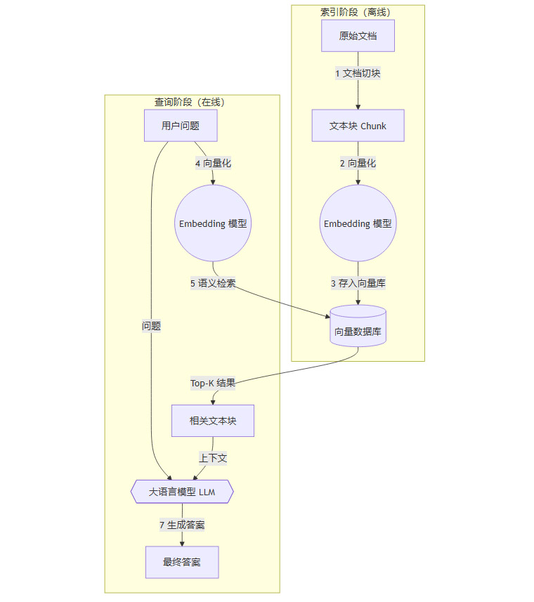 上下文构建与生成:将用户原始问题与检索到的Top-K文本块组合成一个增强的提示词(Prompt),然后将其输入给LLM。LLM基于这些“参考资料”生成最终答案。