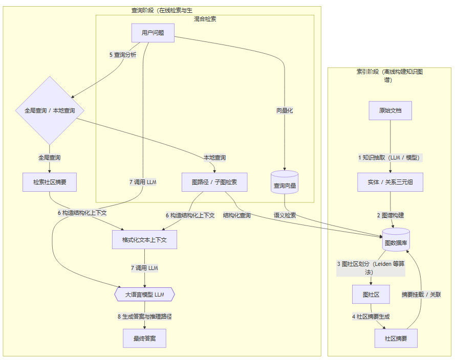 查询时,系统会同时在两个层面进行检索,然后将结果融合。这种“局部细节 + 全局纲要”的组合,能够在较低的工程成本下,显著改善传统RAG关系信息缺失的问题。