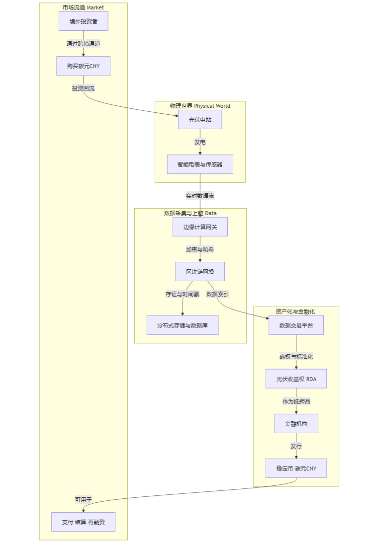 资金监管与清算:项目方获得的稳定币,可以在合规框架内用于融资。而光伏电站实际产生的电费收入,会进入一个由金融机构监管的账户,用于支撑“碳元CNY”的价值和未来的兑付。