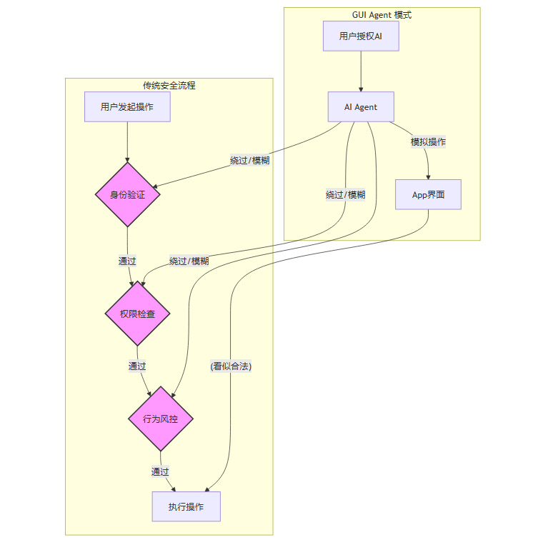 上图清晰地显示,GUI Agent通过一次性的顶层授权,实质上架空了App内部环环相扣的安全验证逻辑。