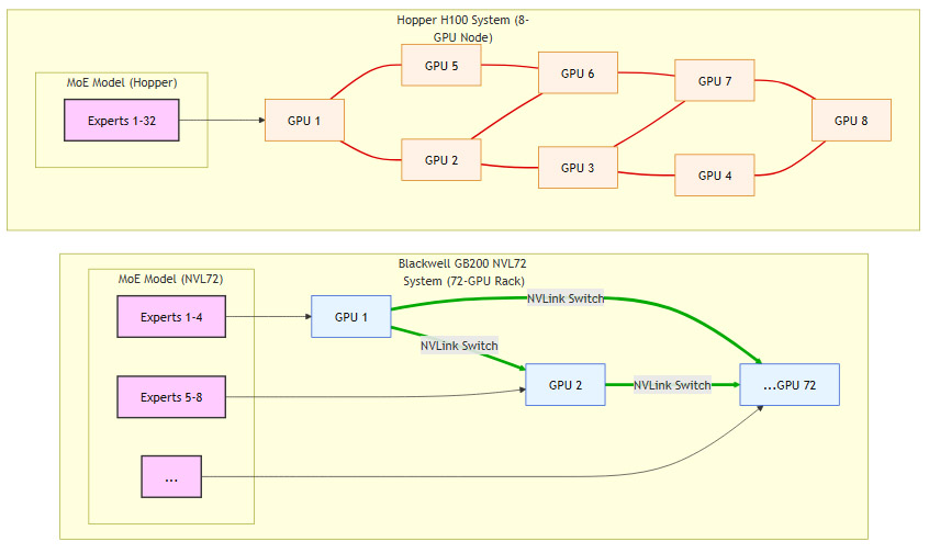 图解:Hopper系统中,单个GPU需承载大量专家,通信受限。Blackwell NVL72系统中,专家分布在多个GPU上,通过高速NVLink Switch实现无缝通信,大幅提升效率。
