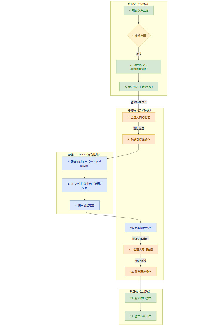 这个流程清晰地展示了资产如何在“合规域”和“流动性域”之间安全、合规地流转,形成一个完整的闭环。