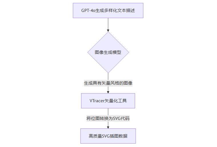 这个流程的精妙之处在于,它首先确保了内容的语义多样性(通过GPT-4o),然后保证了视觉风格的一致性(通过特定的图像生成模型),最后通过高效的矢量化工具VTracer,实现了到结构化SVG代码的转换。