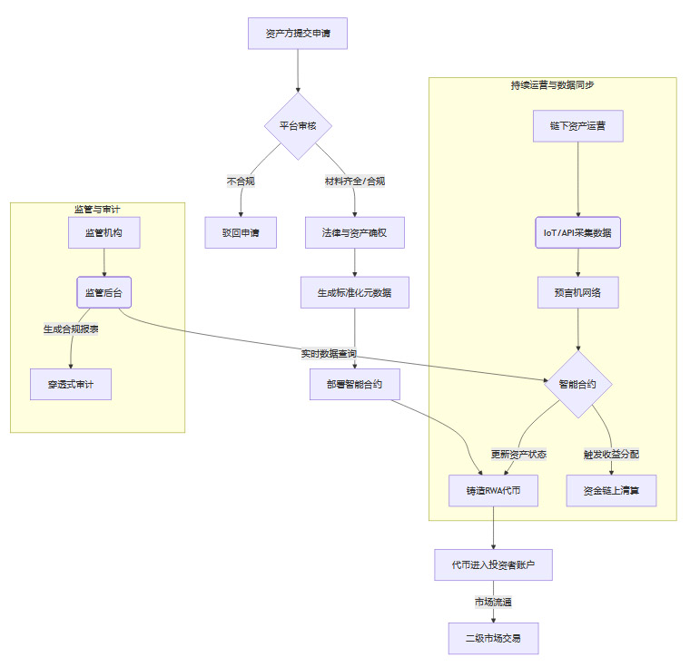 这个流程图清晰地展示了平台如何将资产的登记、确权、代币化、流通、结算等环节,全部纳入一个自动化、透明化的数字化管理体系中。