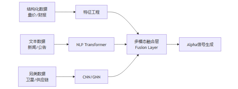 传统量化模型主要依赖结构化数据(如开盘价、收盘价、成交量、财务报表)。这类数据虽然规范,但信息密度已被市场充分挖掘,超额收益(Alpha)日益稀薄。AI技术,尤其是自然语言处理(NLP)和计算机视觉(CV),打破了数据模态的壁垒。