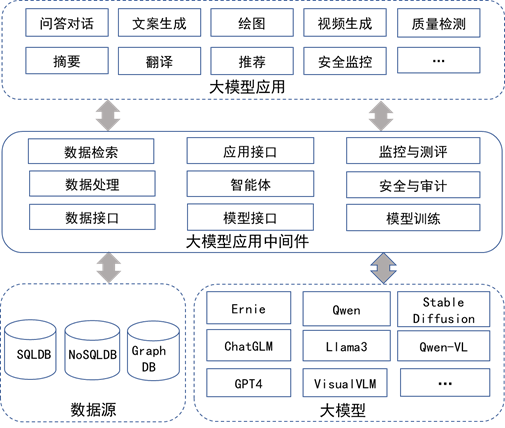 大模型应用中间件系统应介于大模型应用与大模型及数据源之间,给企业大模型应用开发起到桥梁作用。