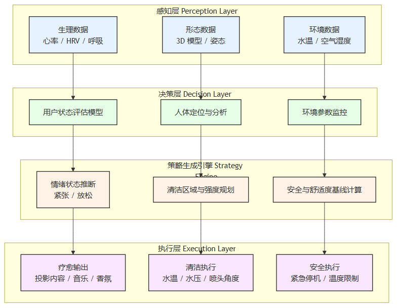 AI自动洗澡机的核心并非单一技术,而是一个由感知、决策、执行三个层面构成的完整技术闭环。这个系统协同工作,将一次简单的洗浴过程,转变为高度个性化、数据驱动的健康护理体验。
