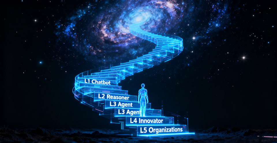 在深入Agent的技术细节之前,我们有必要先明确其在人工智能发展宏图中的位置。OpenAI的CEO山姆·奥特曼(Sam Altman)曾为通往通用人工智能(AGI)的道路描绘了一幅清晰的五阶段进化图。这条路就像一场升级打怪,每一阶段都代表着AI能力的质变。