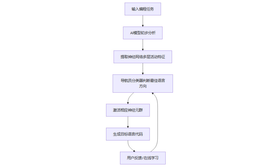 在每一层神经网络中,训练小型“导航员”分类器,实时判断并引导AI选择最合适的编程语言。