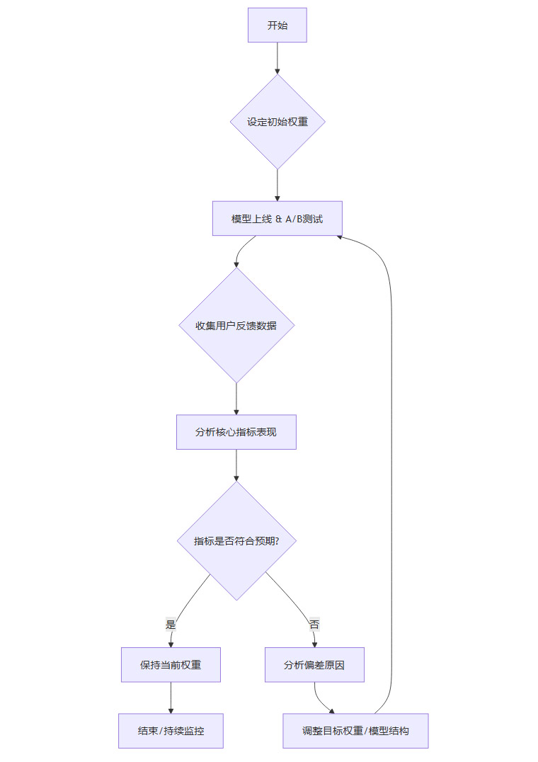 最终得分 = 0.6 * 预估点击率 + 0.3 * 预估完播率 + 0.1 * 预估互动率。在线动态调整 利用A/B测试和在线学习机制,让权重能够实时响应环境变化。例如,系统监测到某类内容的点击率很高但用户停留时间极短,这可能是一个负向信号。此时,在线学习模型可以自动调低点击率目标的权重,同时调高停留时长目标的权重,从而抑制这类内容的推荐。