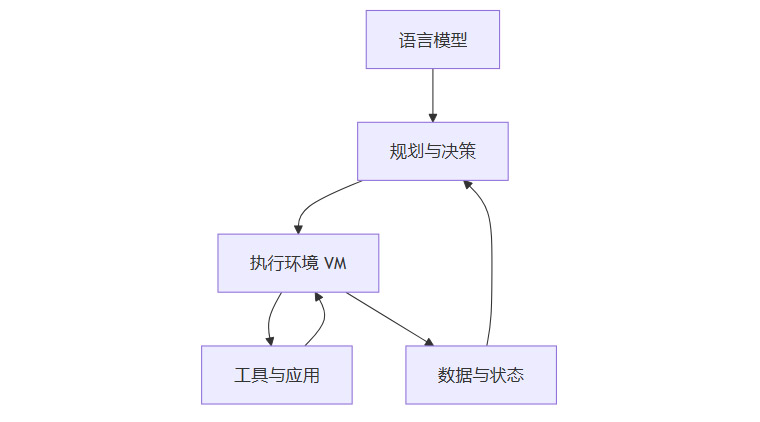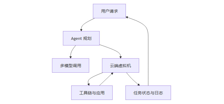 用户请求先进入 Agent 层,由 Agent 进行任务分解和模型调用规划。再由 Agent 控制云端虚拟机调用不同工具,执行真实操作。虚拟机会持续产生状态和日志,既用于任务追踪,也用于后续学习和优化。