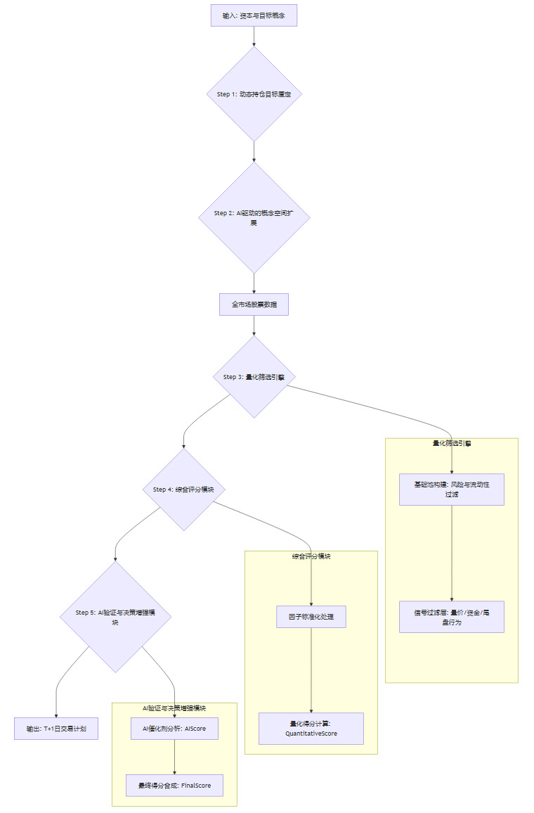 【摘要】一种融合量化筛选与AI验证的双核智能策略。它通过结构化数据捕捉交易形态,再利用非结构化信息探寻内在驱动,旨在实现高确定性的T+1周期Alpha捕捉。