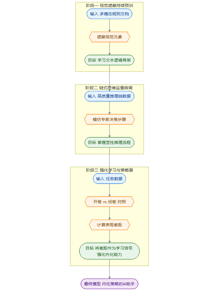 整个训练过程被分解为三个循序渐进的阶段,每个阶段都有明确的目标,层层递进,最终协同完成策略内化的任务。
