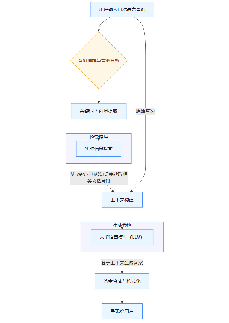 当前主流的 AI 搜索,其技术核心是检索增强生成(Retrieval-Augmented Generation, RAG)。RAG 架构将大型语言模型的生成能力与外部知识库的实时信息检索能力相结合,旨在解决 LLM 内部知识陈旧和容易产生幻觉的问题。