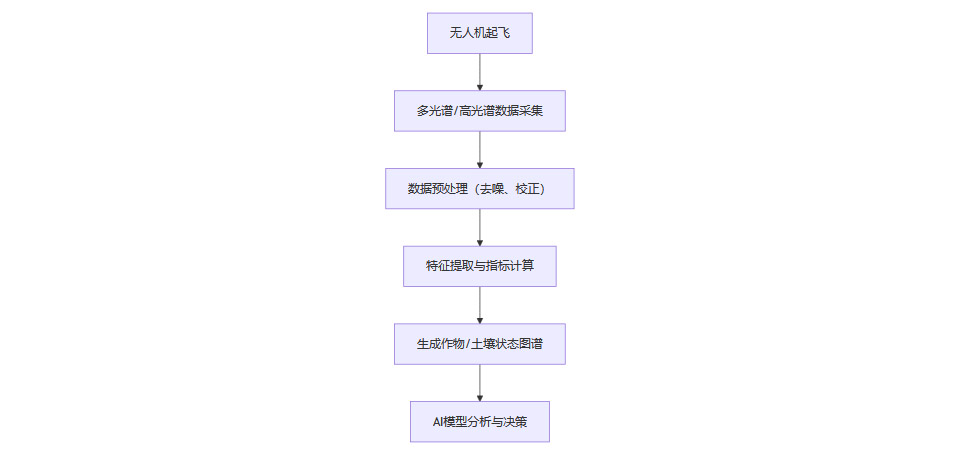无人机高效低空飞行,可在短时间内完成大面积农田的高分辨率扫描,生成作物长势、养分分布、病虫害等多维数据图谱,实现农田的“数字CT”。典型流程如下: