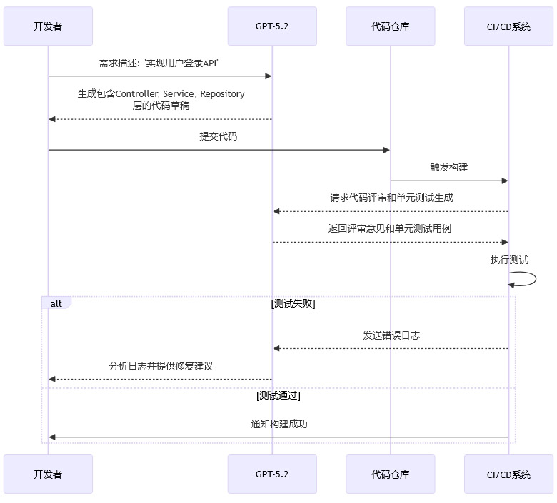 这个序列图展示了GPT-5.2如何深度嵌入软件开发生命周期(SDLC),从需求理解、代码编写、测试到问题修复,全程提供支持。