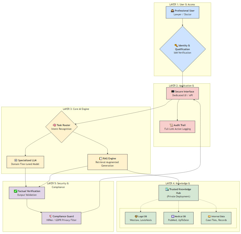 一个面向律师的“ChatGPT法律版”或面向医生的“医疗版”,其技术架构将与通用版截然不同。它会是一个集成了多重可信增强机制的复杂系统。