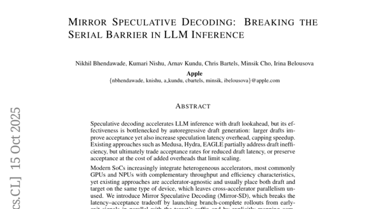 苹果公司提出的 Mirror Speculative Decoding(Mirror-SD)技术,则从根本上挑战了这一串行范式。它并非简单优化某一环节,而是通过重构整个推理流程,引入了“计算重叠”与“异构协同”的核心思想。Mirror-SD 让大模型在“思考”的过程中,就能将“想法”实时同步给小模型,后者则基于这些“想法”提前准备后续内容。这套机制将原本串行的两个阶段,巧妙地转化为并行流水线,实现了推理延迟的“隐藏”。本文将深入剖析 Mirror-SD 的技术原理、系统设计、关键机制及其对未来 AI 应用的深远影响。