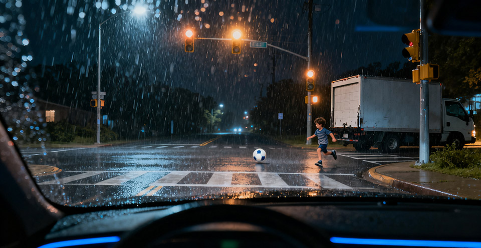 长尾问题是自动驾驶领域挥之不去的“幽灵”。系统可以轻松处理99.9%的常见场景,但真正的挑战在于那0.1%的、罕见且不可预知的极端场景。例如,一个从两辆违停卡车之间突然冲出的“鬼探头”行人,或者一个前车掉落的异形障碍物。
