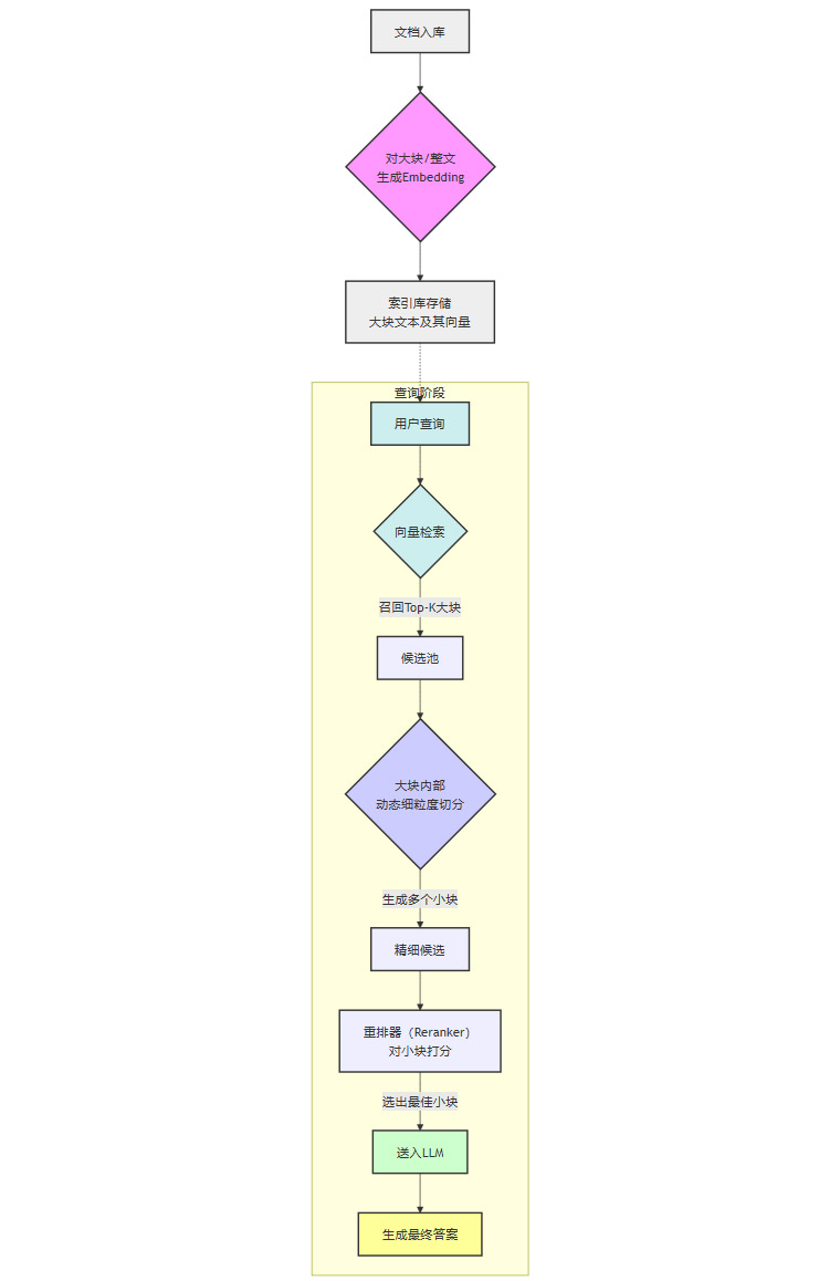 动态细切。接着,在这些被召回的大块内部,实时地、动态地进行更细粒度的切分。切分策略可以很多样,例如,可以围绕与查询最相似的句子进行扩展,形成一个上下文窗口。