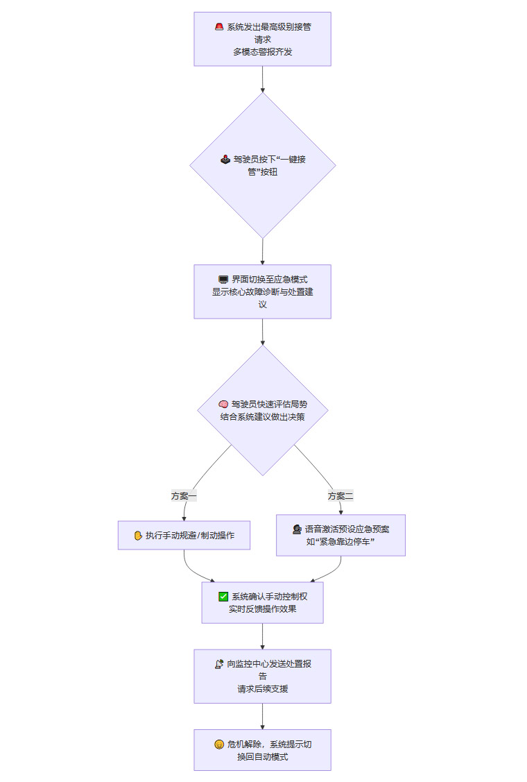 其次,精心设计高效直观的人机交互界面和标准化的应急操作流程,通过多感官协同和个性化适应,确保在万分危急的时刻,人与机器能够实现无缝、精准的权力交接。