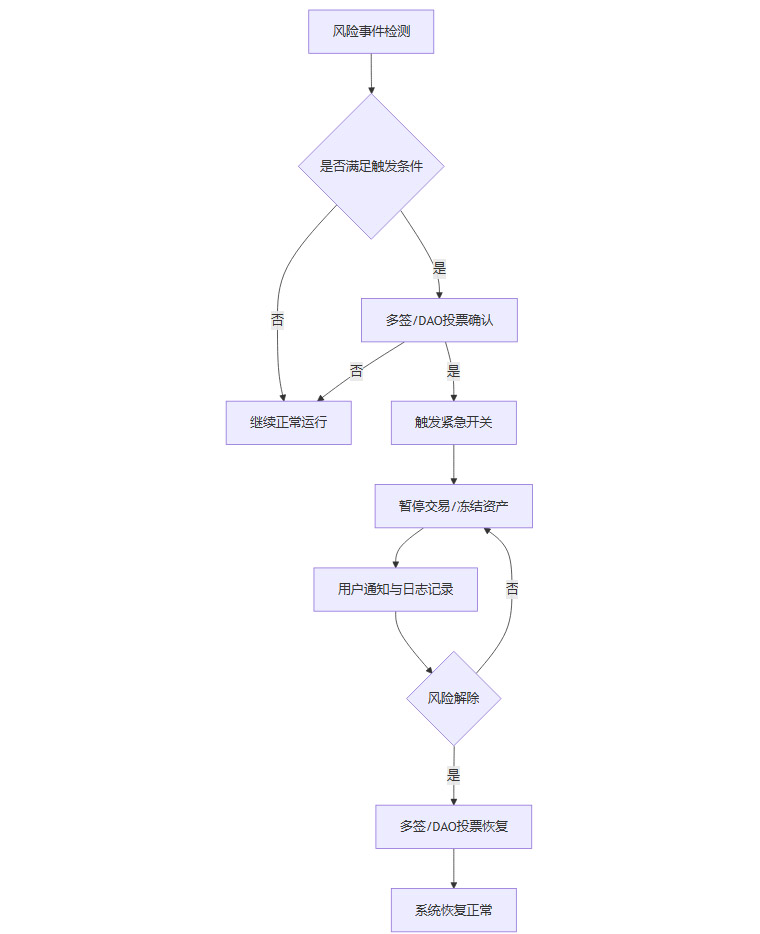 在RWA项目中,紧急开关的设计不仅仅是权限和治理的安排,更需要在技术实现上做到高效、可靠和可追溯。以下以Mermaid流程图形式,展示典型的紧急开关触发与恢复流程:
