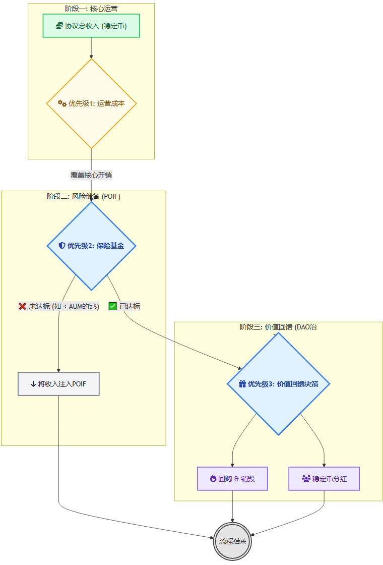 当POIF规模 < 目标规模时:所有扣除OPEX后的协议收入,将**100%**注入POIF,直到其规模达标。这是协议的“防御姿态”。