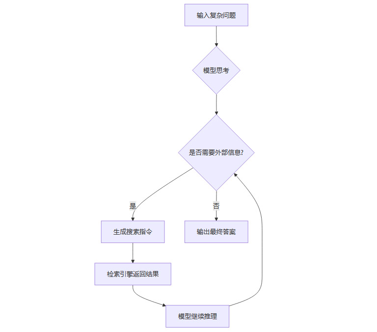 模型在推理过程中可随时发起搜索,形成“思考-搜索-再思考”的循环。