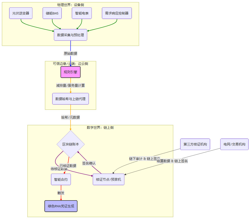 这种“有价值,难融资”的困局,本质上是一个信任与效率的问题。如何让一份减排贡献、一次调峰服务,变成一份像银行存款一样清晰、可信、可流转的资产?答案指向了两个关键技术的融合,MRV(监测、报告、核证)体系的链上化与RWA(现实世界资产)的代币化。