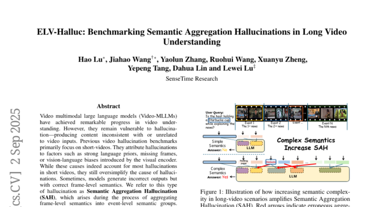 但是,当视频的长度从几十秒延伸到几十分钟甚至几小时,情况就变得复杂起来。商汤研究院的科学家们进行了一项重磅研究,揭示了一个潜藏在长视频理解深处的隐秘缺陷。他们发现,AI在观看长视频时,会产生一种特殊的“记忆混乱”,研究者将其命名为**“语义聚合幻 giác” (Semantic Aggregation Hallucination, SAH)**。