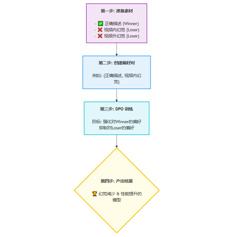 准备素材 基于ELV-Halluc数据集,研究团队创建了约8000对包含正确描述和错误描述的样本。