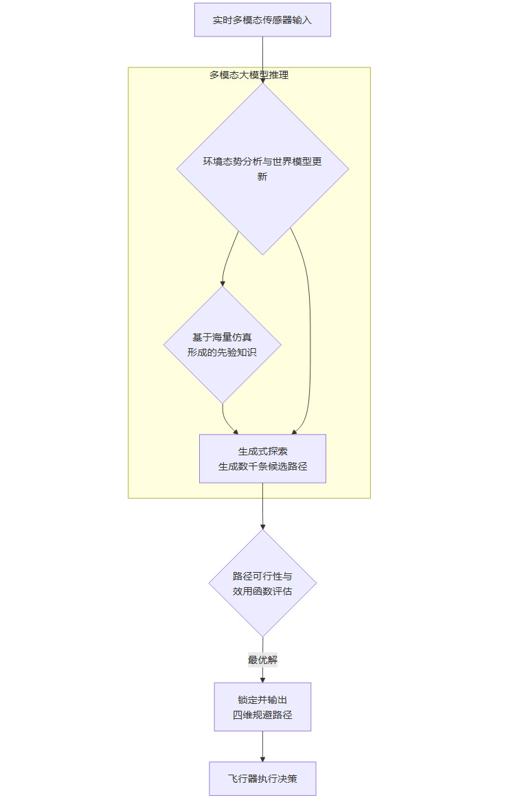 最优解锁定与执行(T=20-30ms):模型对这些生成的轨迹进行快速评估,基于“安全-效率-能耗”等多重目标函数进行排序,选择最优解。这个最优解可能是一个从未预演过的、结合了侧向平移、急速爬升和姿态调整的复杂组合机动。随即,控制指令被发送到飞行器的执行机构(电机、舵面等)。