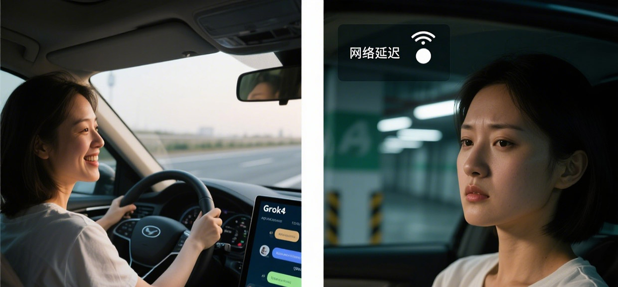 质疑者:指出Grok4目前尚无法控制车辆核心功能(如导航、空调仍需传统语音系统),且依赖高速网络,地下车库等场景存在响应延迟。