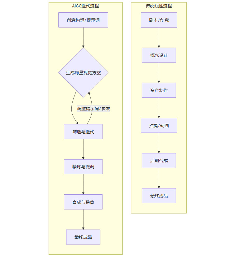 传统影视或动画的生产流程通常是线性的,即“剧本 → 概念设计 → 资产制作 → 拍摄/动画 → 后期合成”。AIGC则引入了逆向化和迭代式的流程。