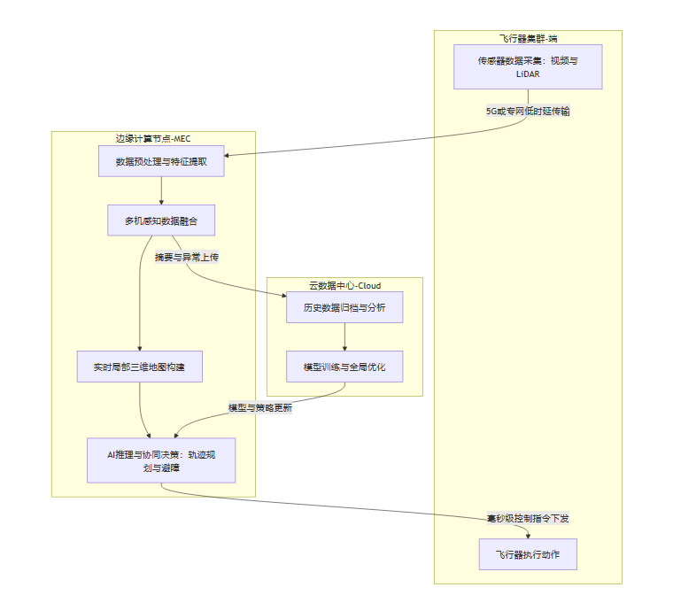 共享态势感知:多架无人机将各自的传感器数据实时上传至同一个MEC节点。边缘节点负责将这些来自不同视角的数据进行时空同步与融合,构建出一个统一、高精度的局部环境地图。