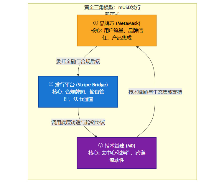 MetaMask、Stripe Bridge、M0,这三者的合作,共同构成了一种全新的稳定币发行范式。我们可以将其总结为“品牌方 + 发行平台 + 技术基建”的黄金三角模型。