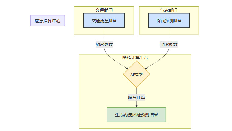 如上图所示,交通部门和气象部门的原始RDA都无需离开各自的服务器。它们只是将数据的加密特征或模型参数发送到隐私计算平台。平台在“黑箱”中完成联合计算,并将最终的预测结果输出给应急指挥中心。整个过程中,任何一方都无法窥探到对方的原始数据。