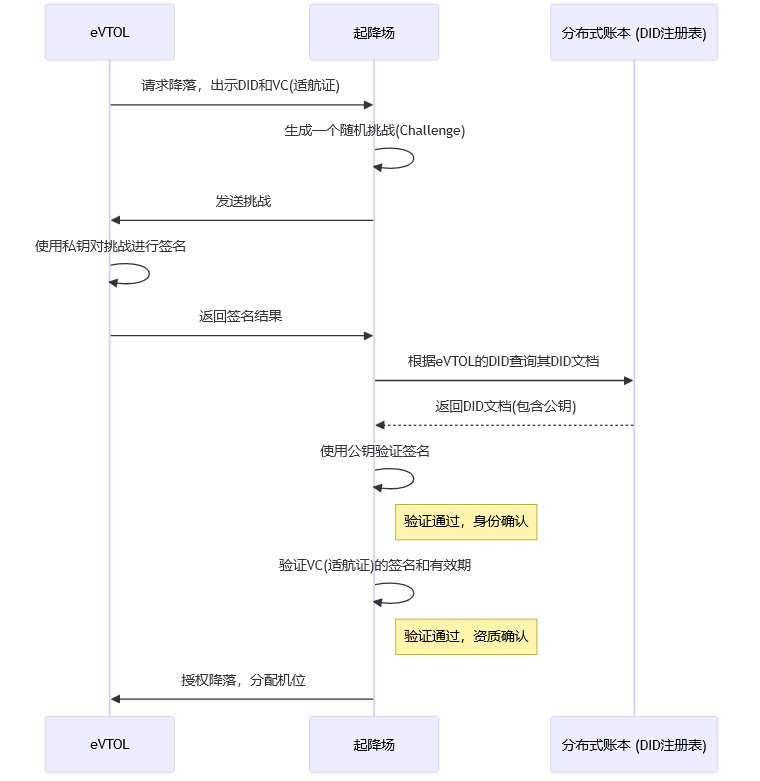 身份验证:当一个实体(如eVTOL)需要向另一个实体(如起降场)证明自己身份时,它会用自己的私钥对一个挑战信息进行签名。起降场通过查询eVTOL的DID文档获取其公钥,然后用公钥验证签名。验证通过,则身份确认。