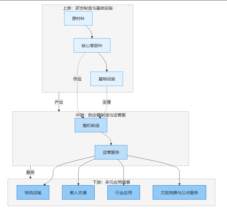 中国低空经济的迷人之处,在于其拥有一个极长且复杂的产业链条。它已经初步构建起一个覆盖研发制造、运营服务到基础设施保障的完整产业生态。这个生态系统可以清晰地划分为上、中、下游三个核心环节。从价值分布来看,这个链条的附加值分配也很有特点。