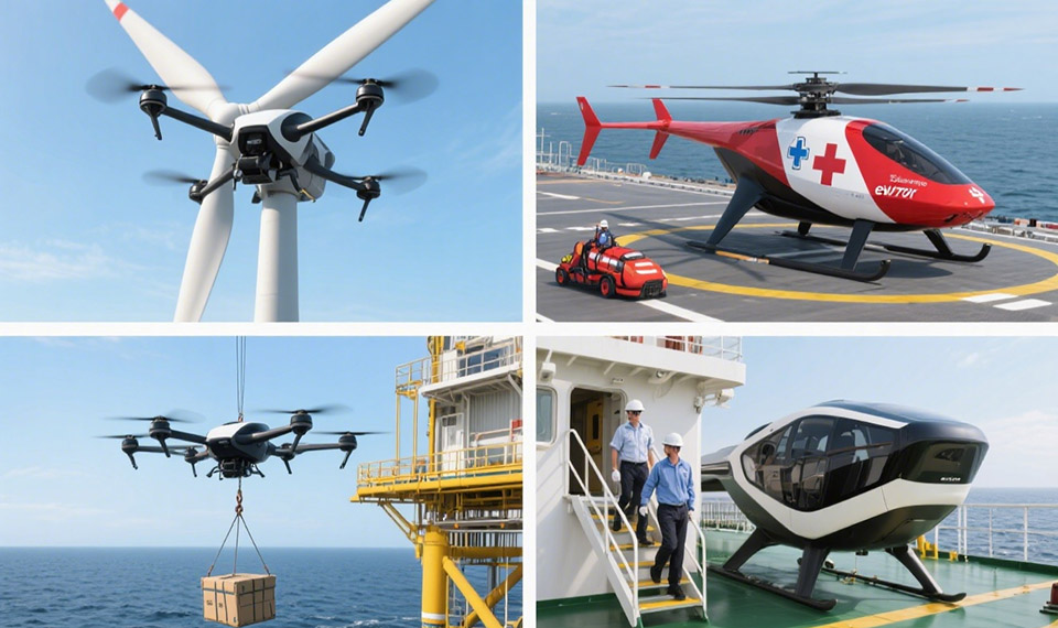 海上油气与风电运维:替代传统直升机执行人员倒班、高价值备件紧急配送、海上风机叶片巡检等任务,大幅降低运营成本和碳排放,同时提升响应速度和安全性。