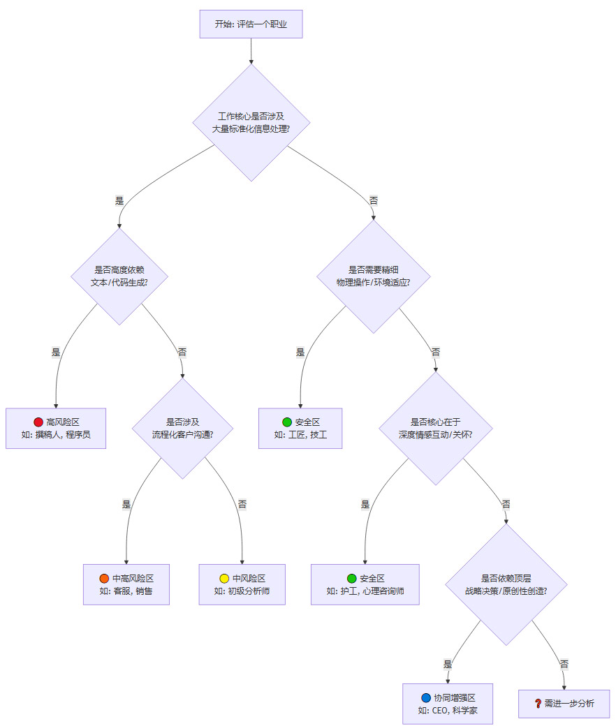 这个流程图清晰地揭示了,职业的安全性并不取决于其“高大上”的程度,而在于其核心任务与AI能力短板的匹配度。一个经验丰富的管道工,其职业安全性可能远高于一个初级的数据标注员。