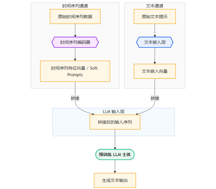 统一处理。拼接后的序列(包含文本嵌入和时间序列软提示)被送入一个标准的、预训练好的LLM中进行处理。LLM的自注意力机制会同时关注文本标记和代表时间序列的软提示,从而实现跨模态的信息交互。