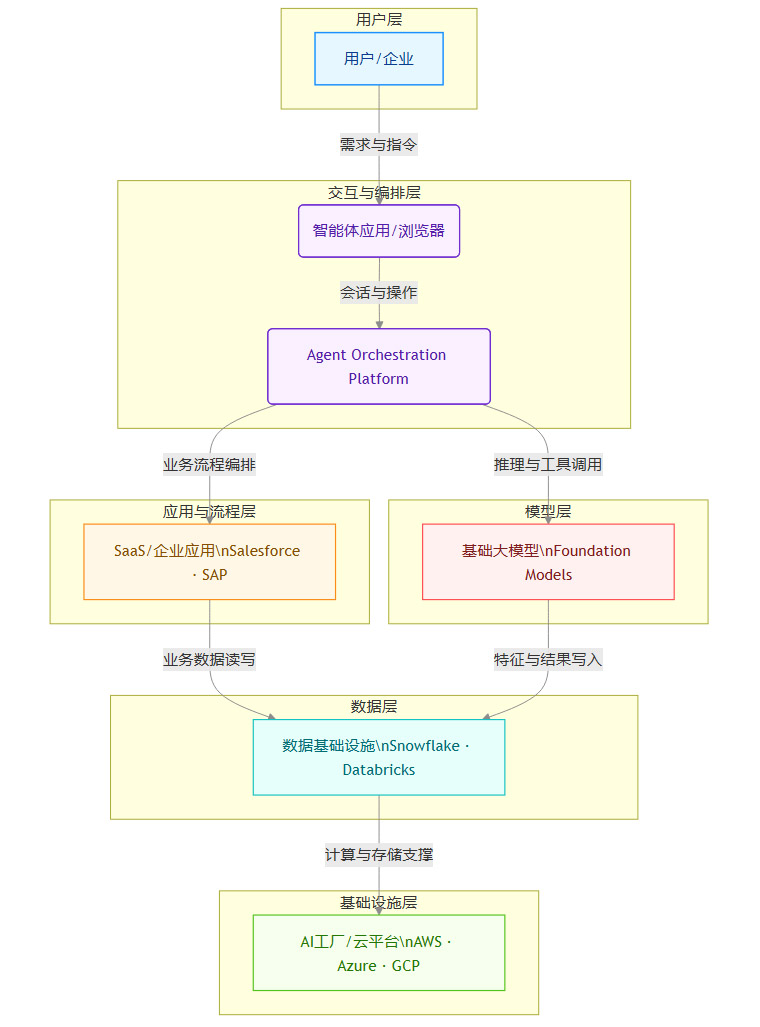 应用与流程层(SaaS/企业应用)。Salesforce、SAP、ServiceNow等公司掌握着企业的核心业务流程。智能体要创造价值,必须与这些流程深度集成。