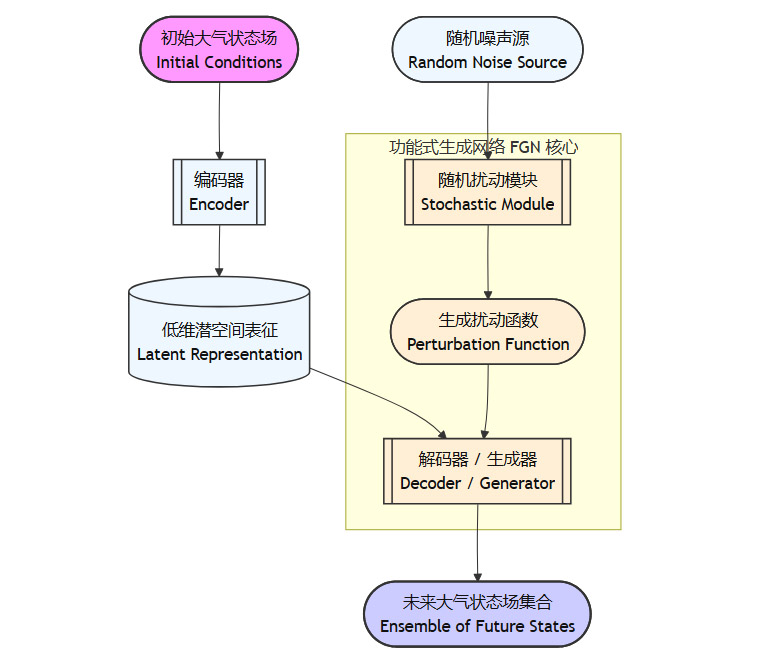 解码器/生成器 (Decoder/Generator):解码器接收低维潜空间表征,并结合随机扰动模块生成的扰动函数,共同重建出未来的高维大气状态场。关键在于,随机性不是简单地加在潜变量上,而是通过一个函数作用于整个生成过程,这使得扰动能够在空间上保持连续性和物理相关性,避免产生不真实的噪点。