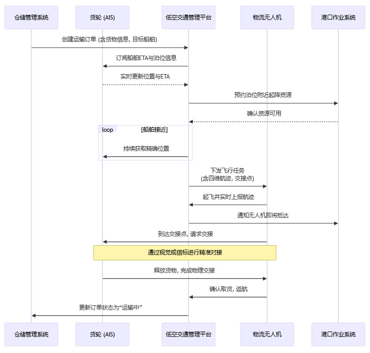• 信息物理融合:核心是实现信息流与物理实体的同步。例如,当一艘货轮即将抵达港口时,其AIS系统发出的位置和预计到达时间(ETA)信息,应能被低空物流调度平台自动捕获。平台据此提前调度无人机飞往指定泊位,在船舶靠港的同时,完成高价值货物的“船上取件”。