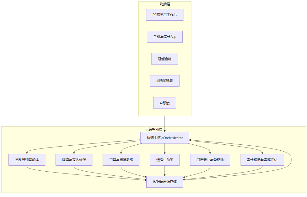 小学一到三年级承上启下。一端连接着学龄前的启蒙和游戏,一端通往高年级的系统学习与应试环境。整合式 AI 陪学系统在这一阶段的设计成败,将直接影响后续各阶段的空间。以多智能体和多终端为基础的架构,使系统可以在学科辅导、情绪支持和习惯养成三个维度并行推进,同时在家长端构建一套以尊重与可解释性为核心的反馈机制。